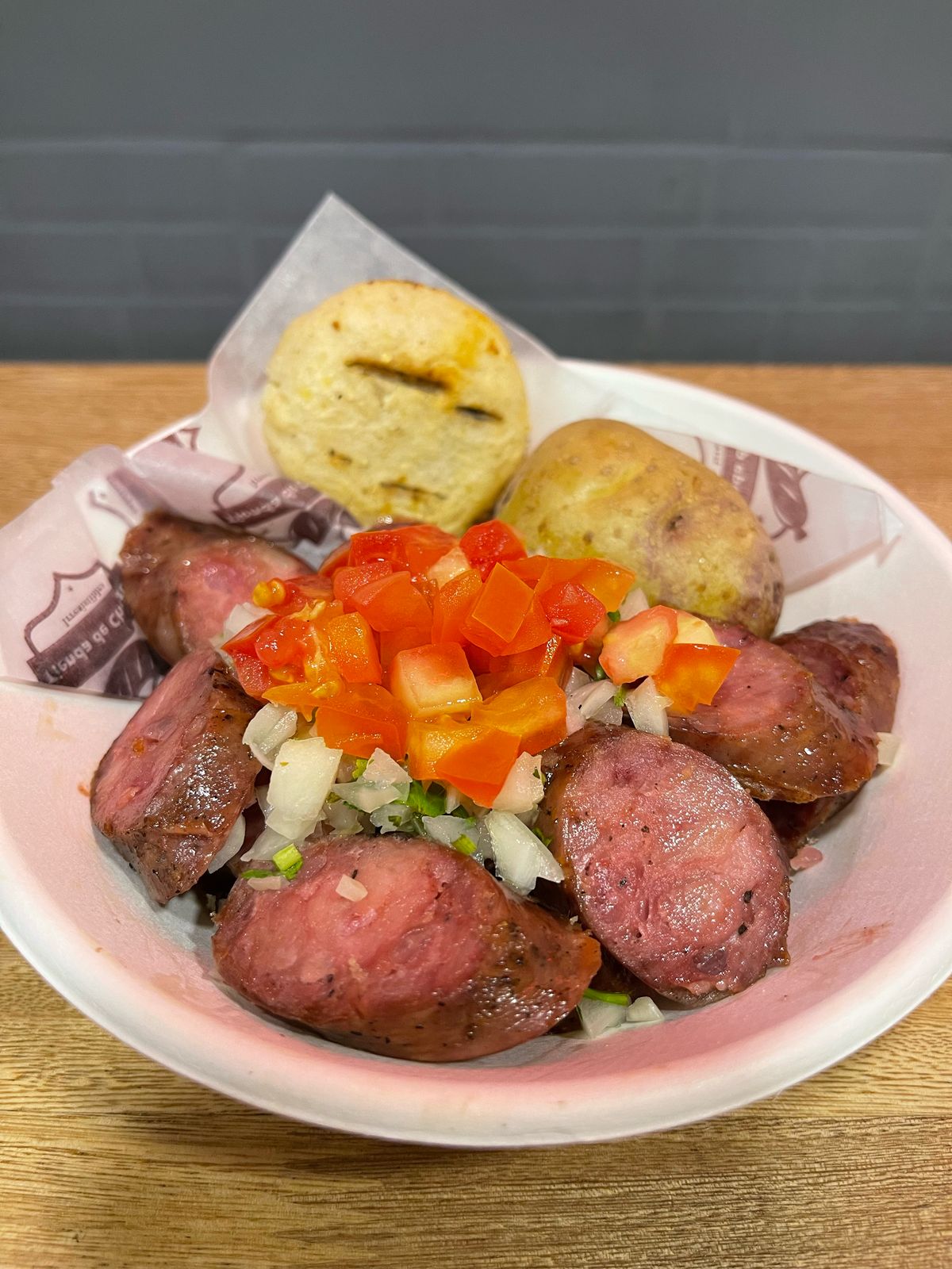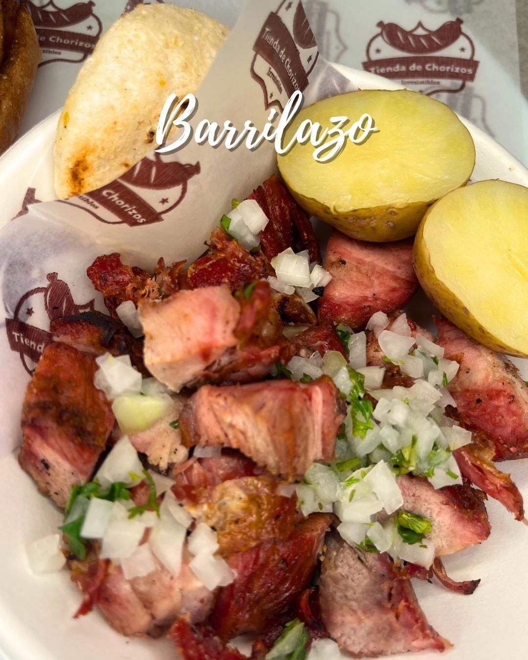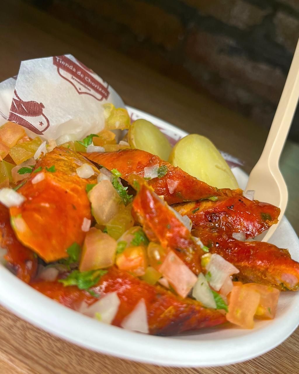 Chorizo argentino en notas de nuez moscada, orégano, cortado en rodajas con mojo cubano de la casa, tomate picado, papa cocida y arepa.