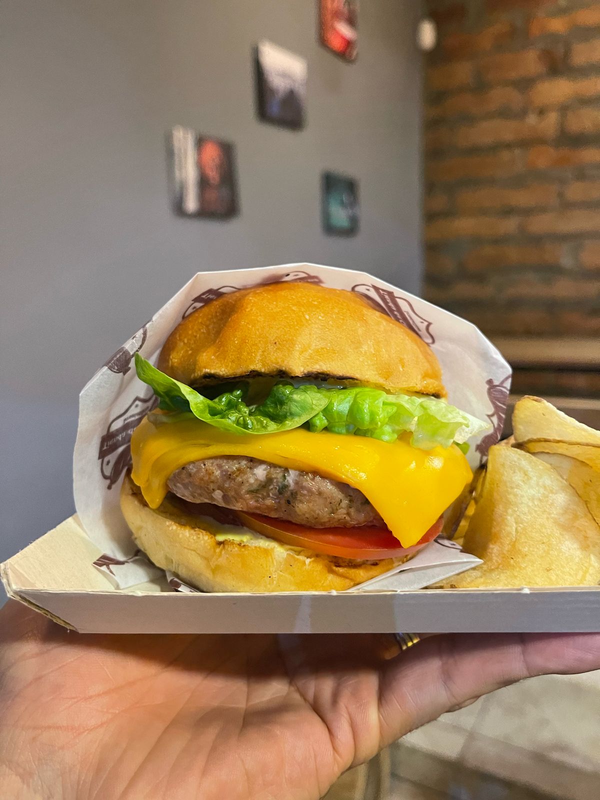 Hamburguesa de carne artesanal mixta de 120g, con pan de papa, cogollo europeo, tomate, tocineta, queso cheddar acompañada de papas a las francesas
