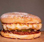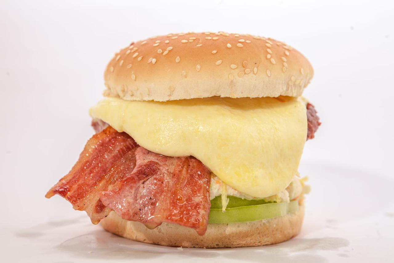 Pan briochet grande, queso, ensalada de la casa, tocineta, ripio de papas, cebolla y salsas de la casa.