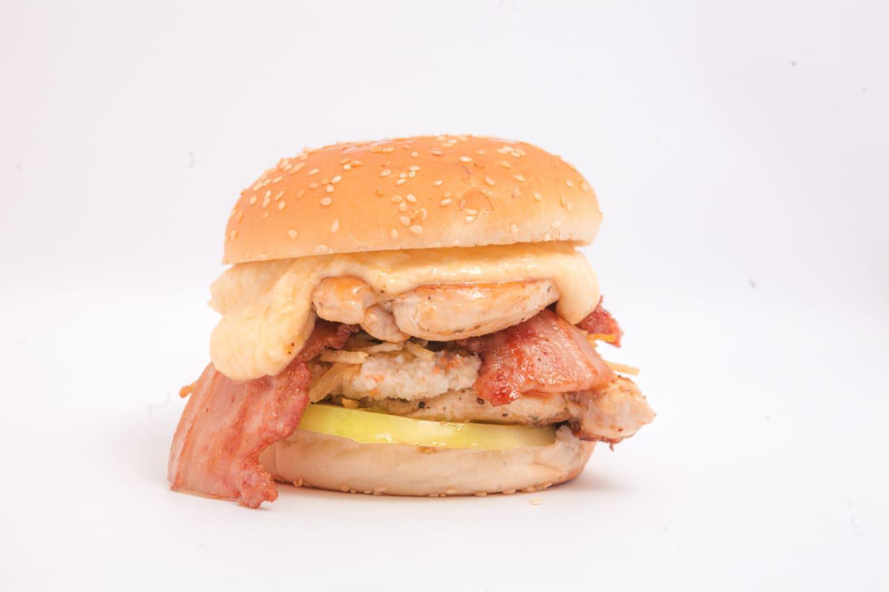 Pan briochet, doble carne de hamburguesa, doble tocineta, doble queso, ensalada de la casa, ripio de papas, cebolla y salsas de la casa.