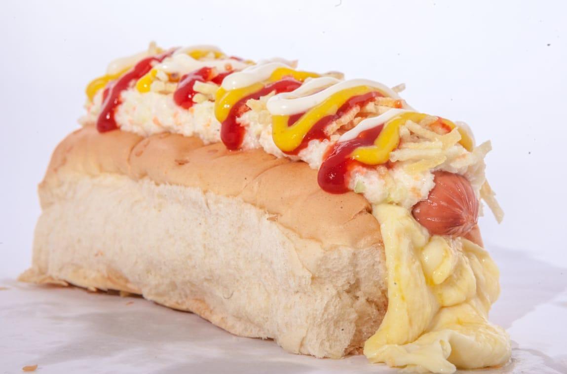 Pan briochet, salchicha, ensalada de la casa, ripio de papas, queso, cebolla, tocineta y salsas de la casa.