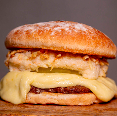 Pan briochet, carne de hamburguesa, queso, ensalada de la casa, ripio de papas, cebolla y salsas de la casa.