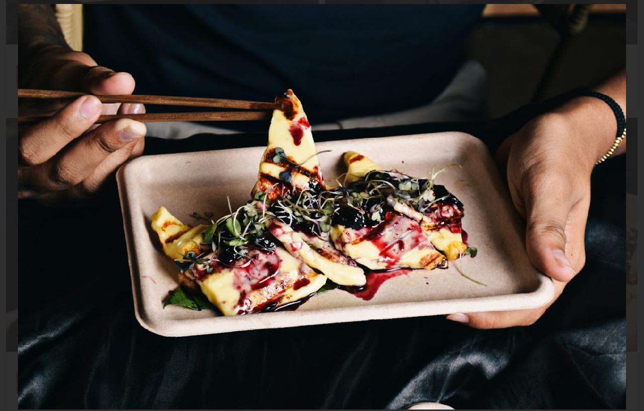 Jugoso queso papialpa pasado por grill, en reducción de arándanos y flor de jamaica, reposado en piña tatemada.