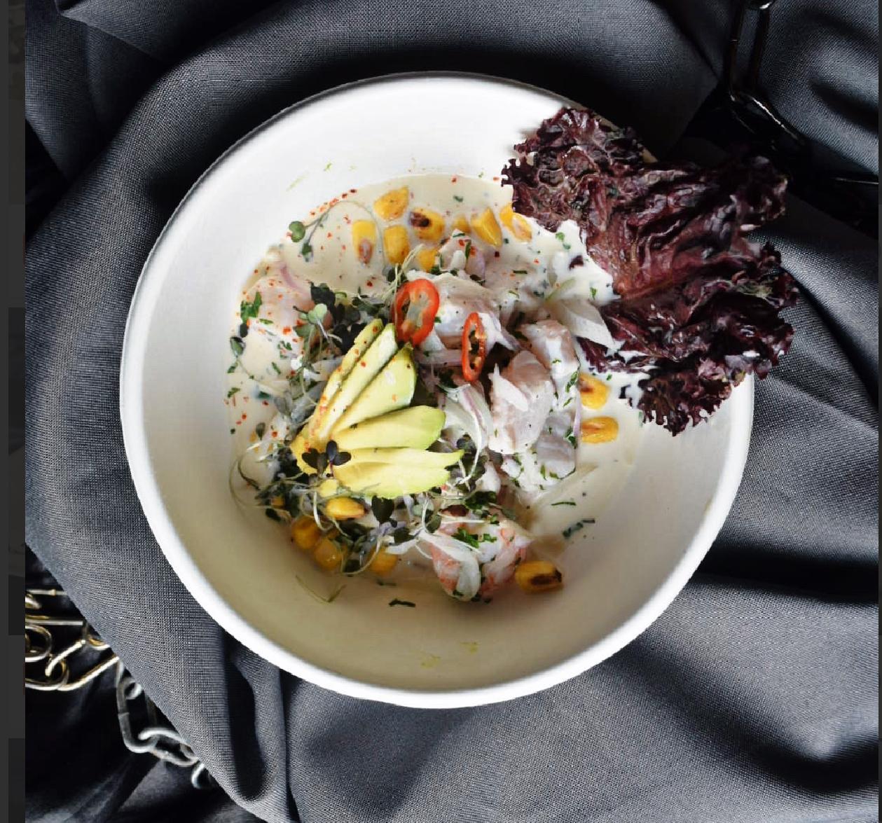 Combinación perfecta de pescado fresco y camarón blanqueado en leche de tigre cremosa, cama de tostón verde, aguacate y maíz crocante.