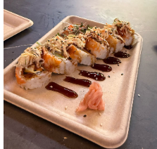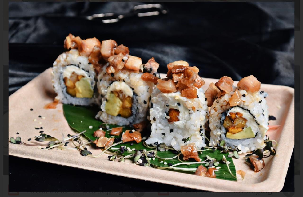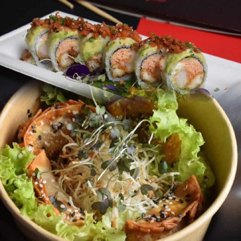 Perfecta combinación de mar con langostinos crocantes y kani cremoso, aguacate japo, vegetales frescos en cama de arroz de sushi.
