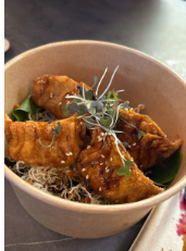 Empanada japonesa en masa crocante rellena de camarón oriental y vegetales, con salsa teriyaki y miel de jengibre.
