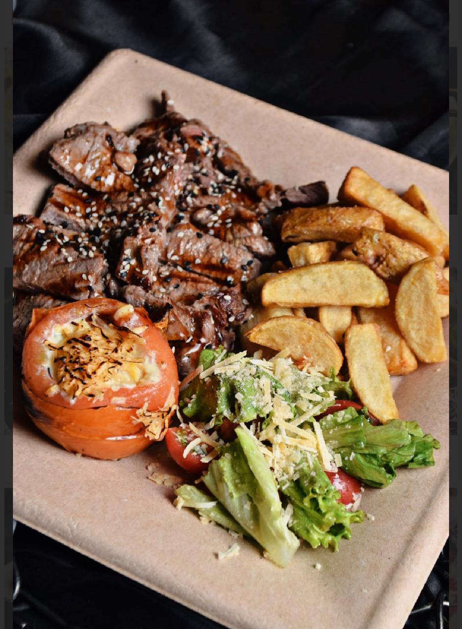 Corte premium de res en parrilla a punto, con papa rustica, tomate relleno de maíz tierno dulce, queso parmesano, ensalada parrillera y chimichurri oriental