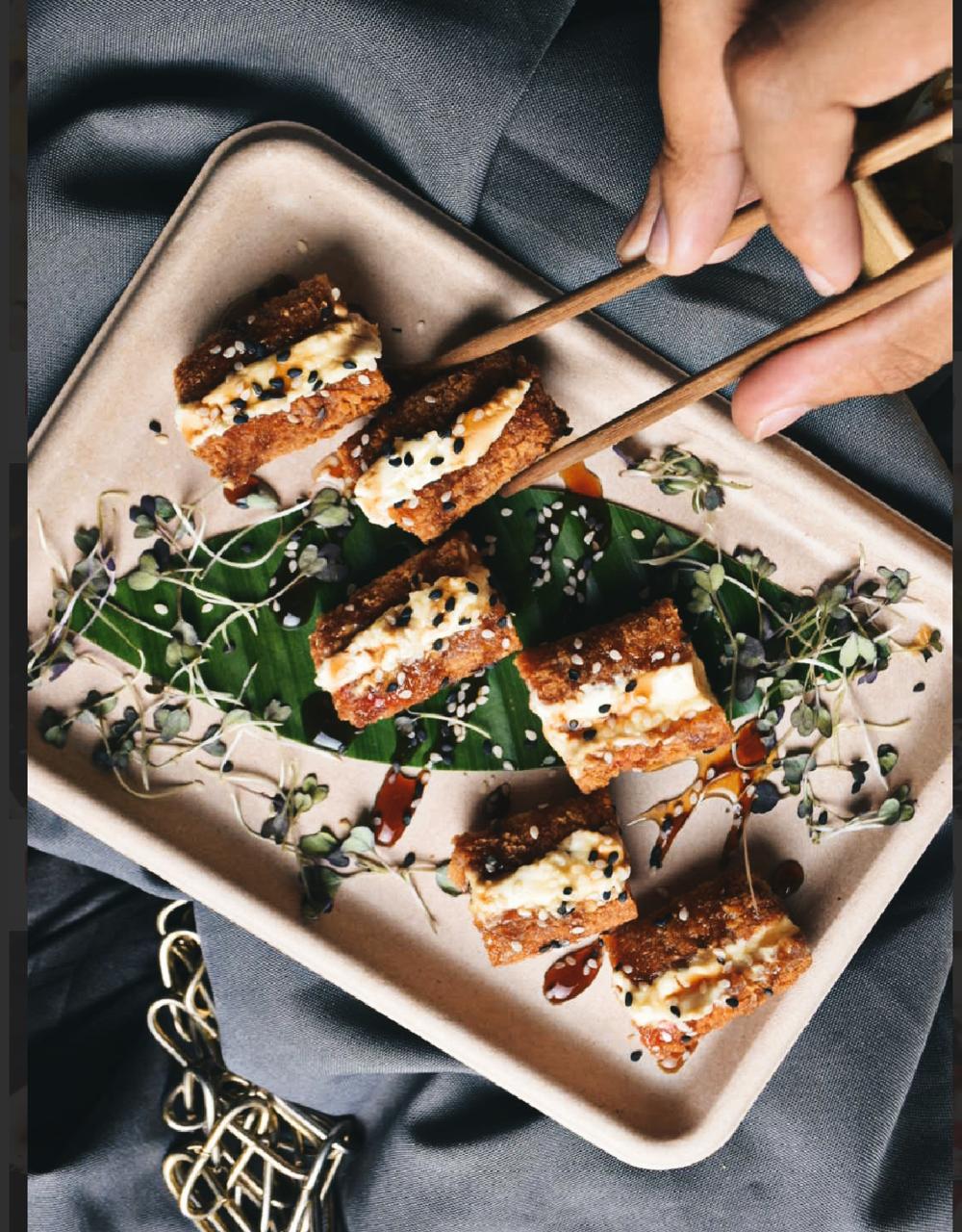 Surimi de cangrejo en panko japonés, coronado con queso crema, bañados en miel de jengibre y teriyaki