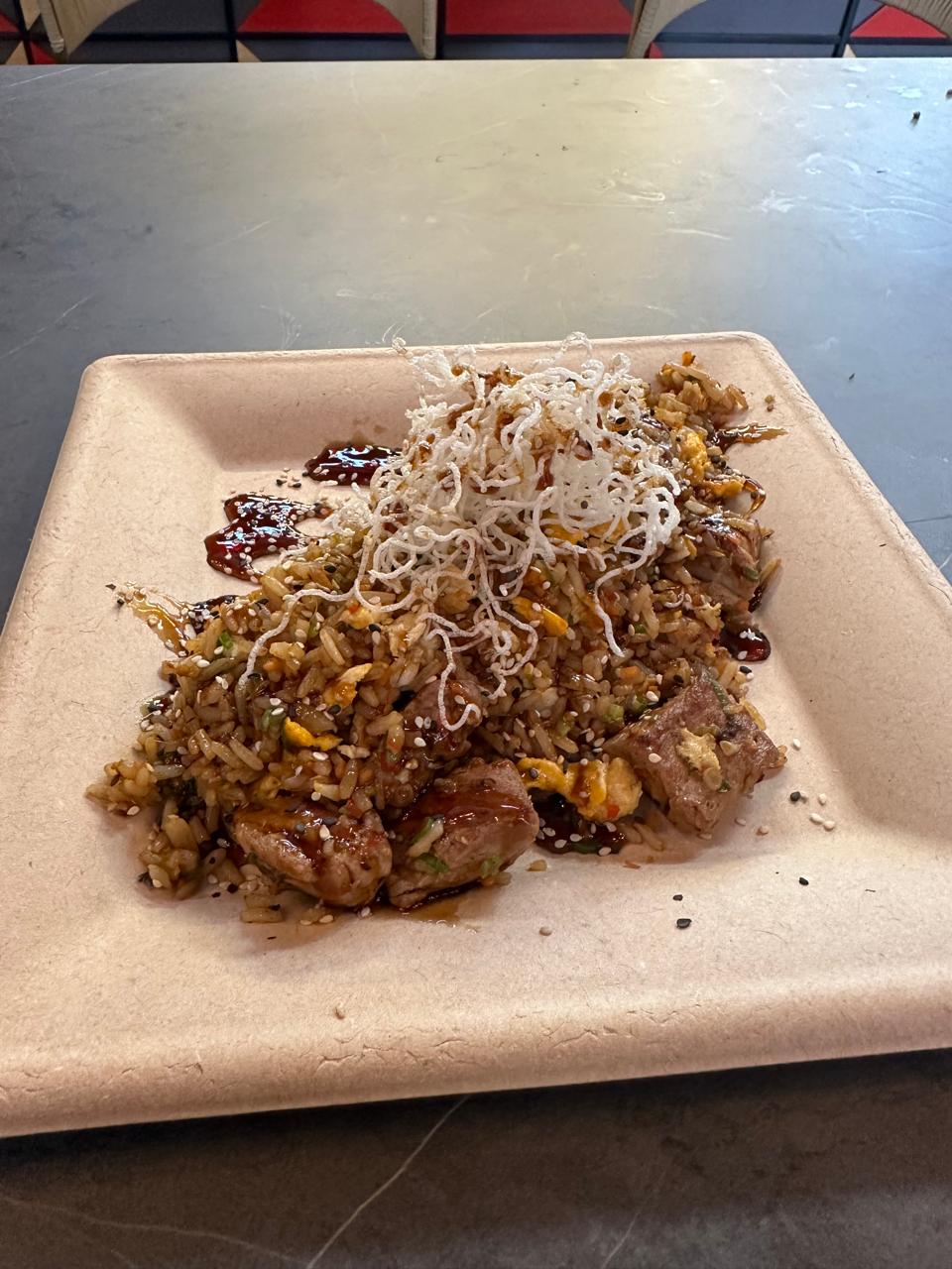 Arroz chaufan salteado al wok con vegetales frescos, soya y teriyaki, solomito de cerdo y vermichelly crocante