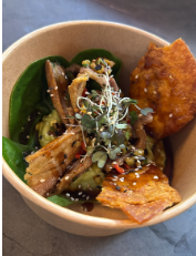 Rico roll con chicharrón crocante y caramelizado, sobre cama de lechuga, combinando en su interior plátano maduro, aguacate y queso crema.