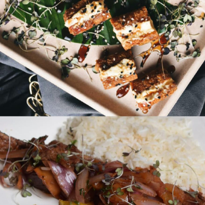 Tradicional peruano con mezcla oriental , salteado a fuego alto , carne roja con vegetales, arroz blanco y papa crocante.