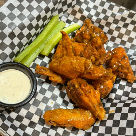 10 piezas de jugosas alitas de pollo, marinadas y luego doradas al punto perfecto en la parrilla. Bañadas en salsa Búfalo original de Nueva York. Servidas con aderezo cremoso y bastones de apio