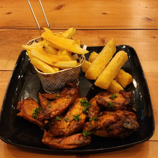10 piezas de alitas de pollo seleccionadas, fritas hasta lograr una corteza dorada y crujiente, luego glaseadas generosamente en nuestra salsa BBQ artesanal. El resultado es una explosión de textura llenas de sabor brindando una experiencia que combina lo mejor de la cocina americana con el arte de la barbacoa. Viene con dos acompañantes a tu eleccio