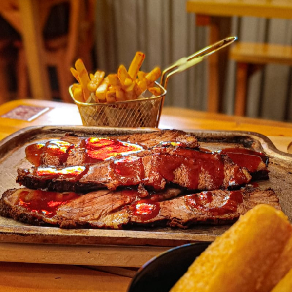 Corte de pecho de res seleccionado, ahumado lentamente durante horas para lograr una textura suave y jugosa, con un sabor profundo que se potencia al servirlo con nuestra exclusiva salsa bourbon. Este brisket es ideal para quienes buscan una experiencia BBQ sofisticada y llena de matices.