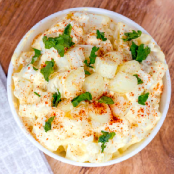 Papas cocidas mezcladas con aderezo suave, huevo y un toque de mostaza, servidas frías y frescas.