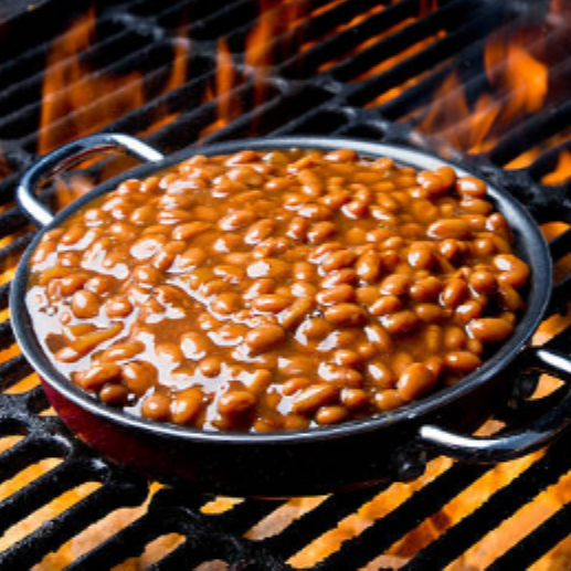 Frijoles suaves cocidos en salsa dulce y ahumada, una tradición ineludible en la mesa.