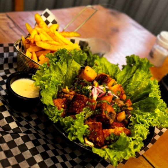 Papas fritas especialmente sazonadas y cubiertas con proteína vegetal artesanal, escabeche de pimientos, barbacoa bourbon, queso fundido, guacamole y salsas de la casa para compartir o disfrutar solo.