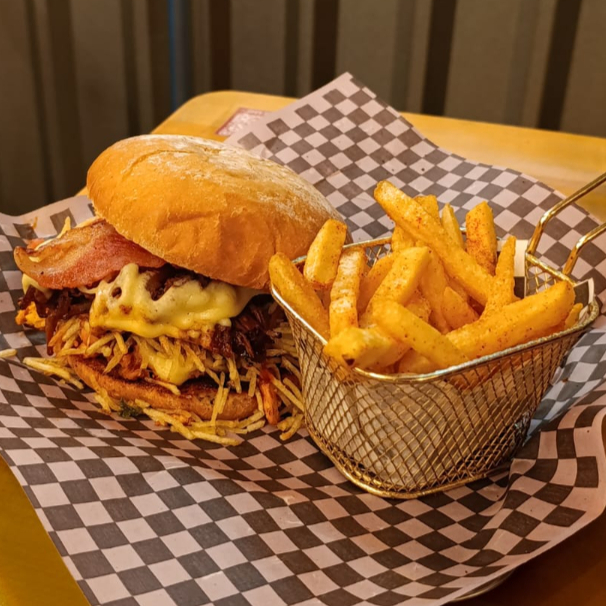 Hamburguesa artesanal de proteína vegetal, dorada en la plancha con un sofrito caramelizado y salsas BBQ caseras que fusionan la tradición americana con el gusto vegetariano.