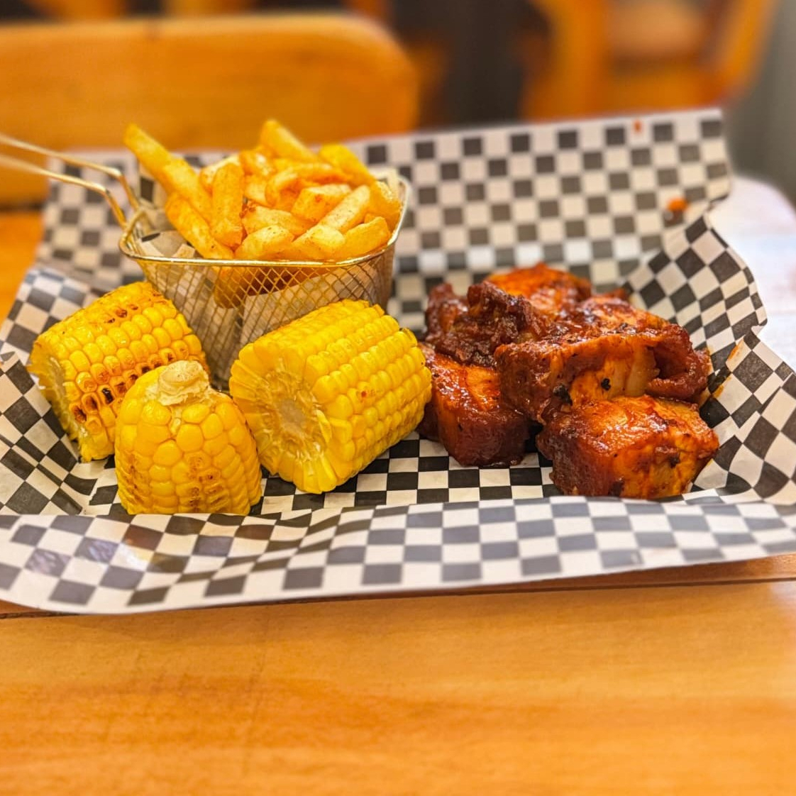 Jugosas y tiernas costillas de cerdo cuidadosamente sazonadas y cocinadas a fuego lento. Puedes disfrutarlas bañadas en nuestra salsa BBQ artesanal, que aporta un equilibrio entre dulzura, ahumado y vinagre, o en su versión seca, con un aliño de especias que realza los sabores naturales de la carne. Viene con dos acompañantes a tu eleccion.