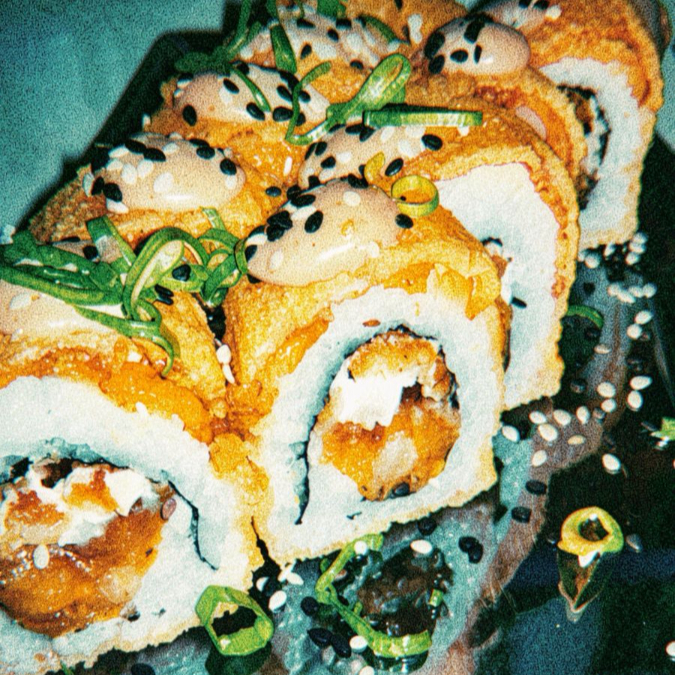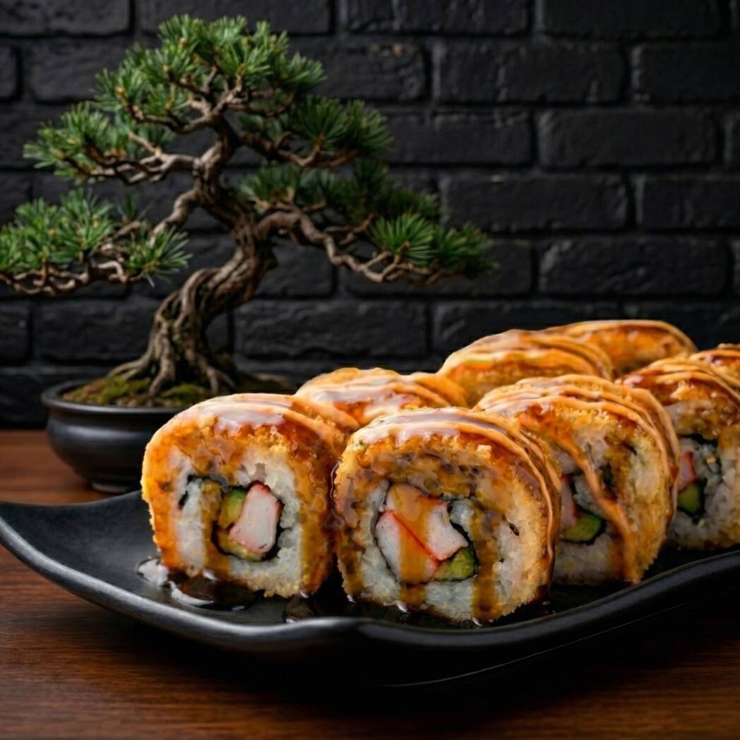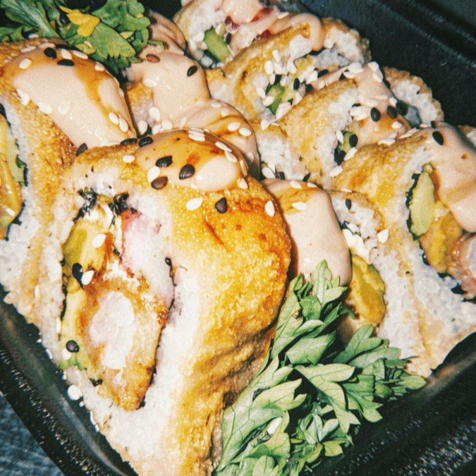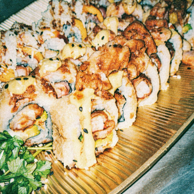 Delicioso rollo de Palmito de cangrejo tempura aguacate fresco y queso crema con mayo spicy y teriyaki.