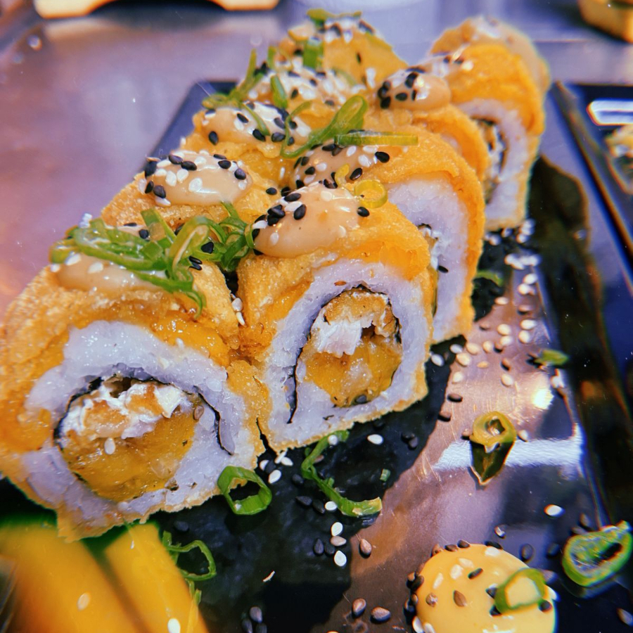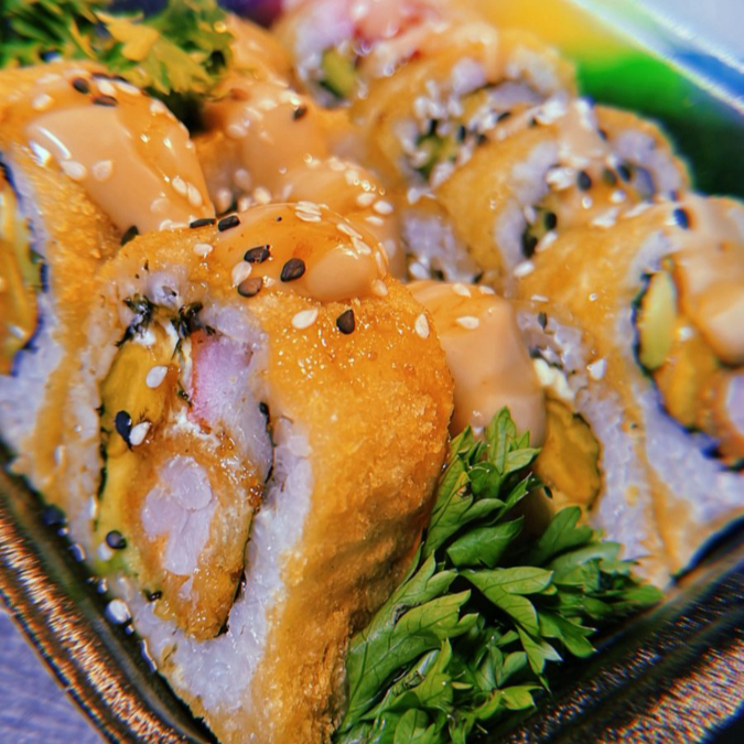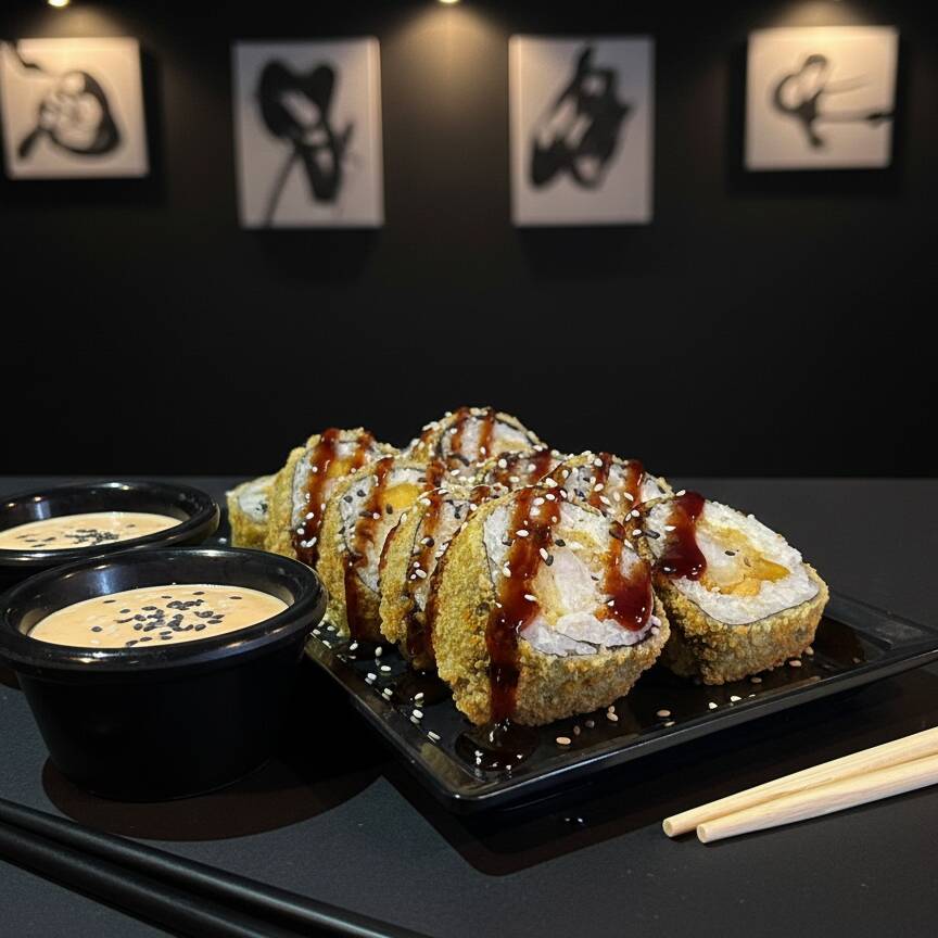 Crocante por fuera, cremoso por dentro! 🔥 Rollo tempurizado relleno de tilapia apanada, plátano maduro y doble queso crema. Terminado con un baño de salsa Teriyaki brillante. ¡Si amas el sushi apanado, este es tu nuevo favorito!