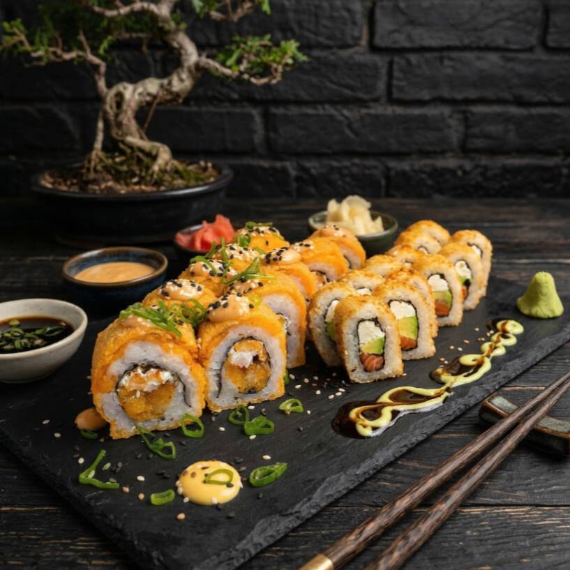 Salmón ahumado, camarón tempura, cebolla frita y maduro. Apanado y bañado en salsa Fuji. 💣 ¡Una bomba de sabor!