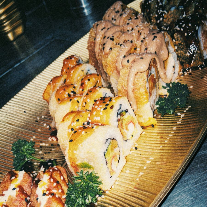 Camarón panko, cangrejo, aguacate, queso crema y maduro. Bañado en Mayonesa japonesa y teriyaki. 🌴 Tropical y equilibrado.