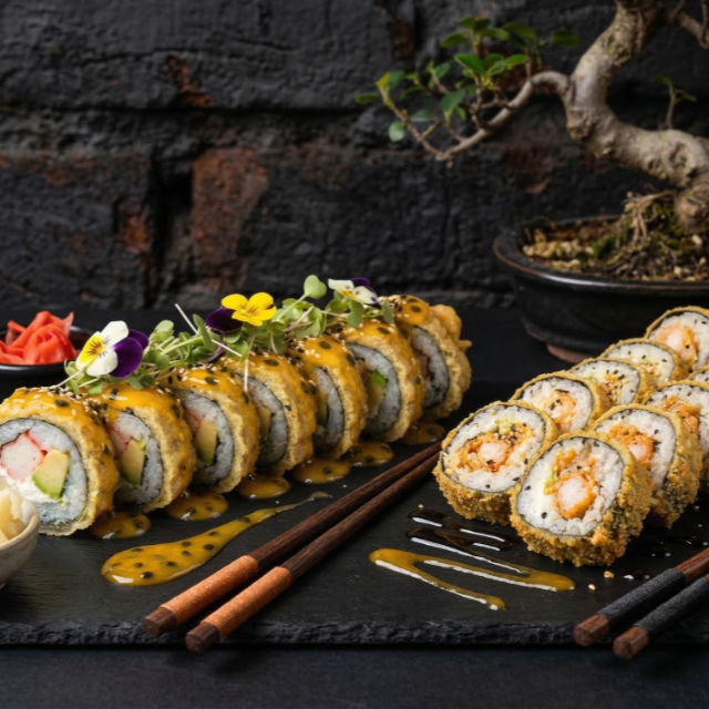 10 piezas: palmito de cangrejo empanado, pescado blanco, aguacate y queso crema, acompañadas de salsa de maracuyá.