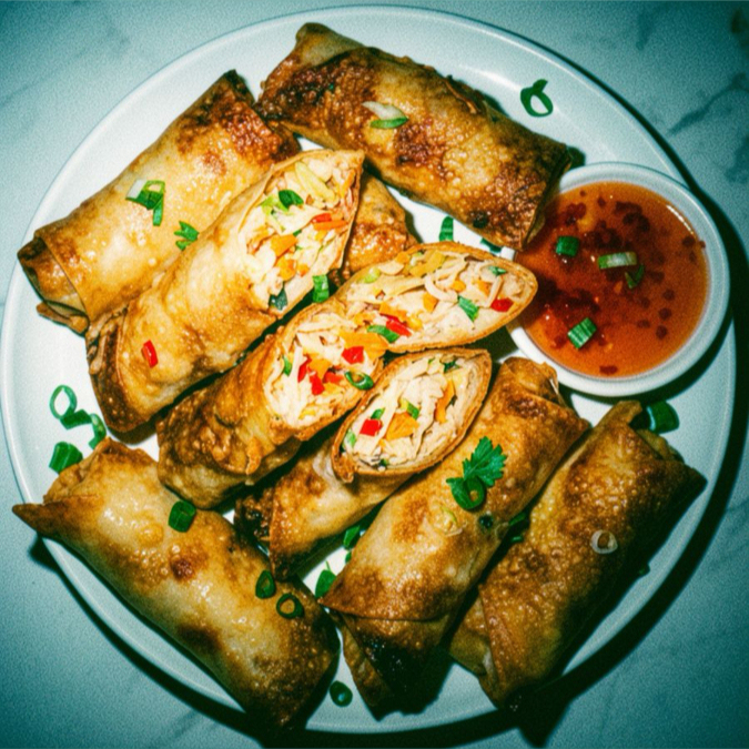 "No son de vegetales." Aquí comemos proteína: Cerdo, Pollo o Camarón. Envueltos en masa crocante porque la vida es muy corta para comer ensalada. Si no cruje, no es Tora.