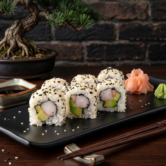 Surimi, pepino y aguacate con un toque de queso crema, todo envuelto en una lluvia de caviar naranja. ¡Tu nuevo favorito!