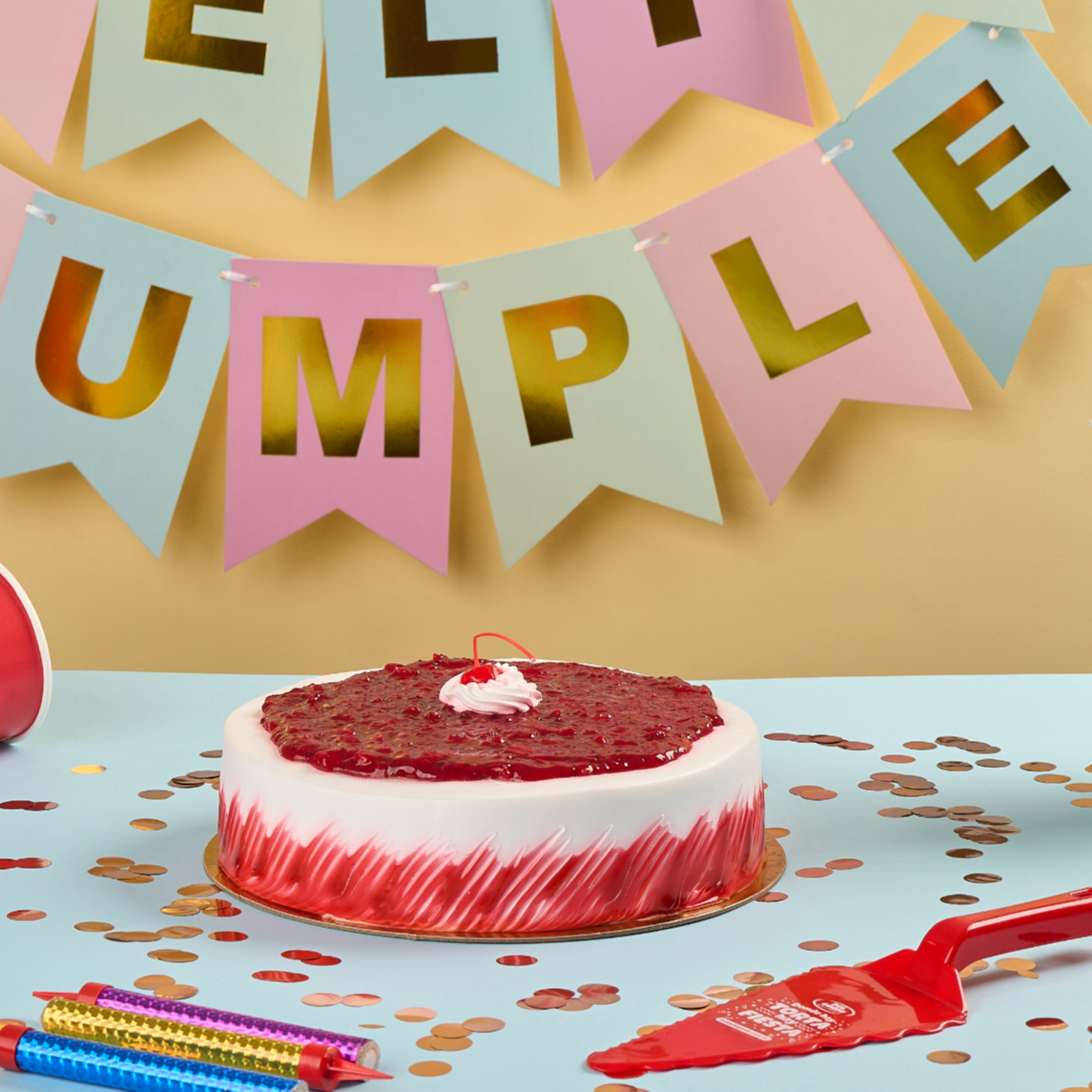 4 porciones, Dos capas de torta de vainilla levemente humedecidas para hacerlas más suave. En su interior encontrarás un delicioso relleno de mermelada y trozos de mora, fresa y cereza integrados. Decorado con una exquisita cobertura de crema de vainilla, con glaseado de frutos rojos, y el toque final se lo da una mermelada con trozos de mora, fresa y cereza en la parte superior