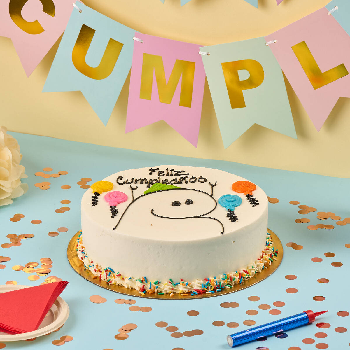10 Porciones, dos capas de torta casera con un característico sabor a leche en polvo, que la hace más suave. En su interior encontrarás un delicioso relleno de arequipe. Cubierta con una crema suave sabor a almendras, decorado con un meme con globos y leyenda de feliz cumpleaños.