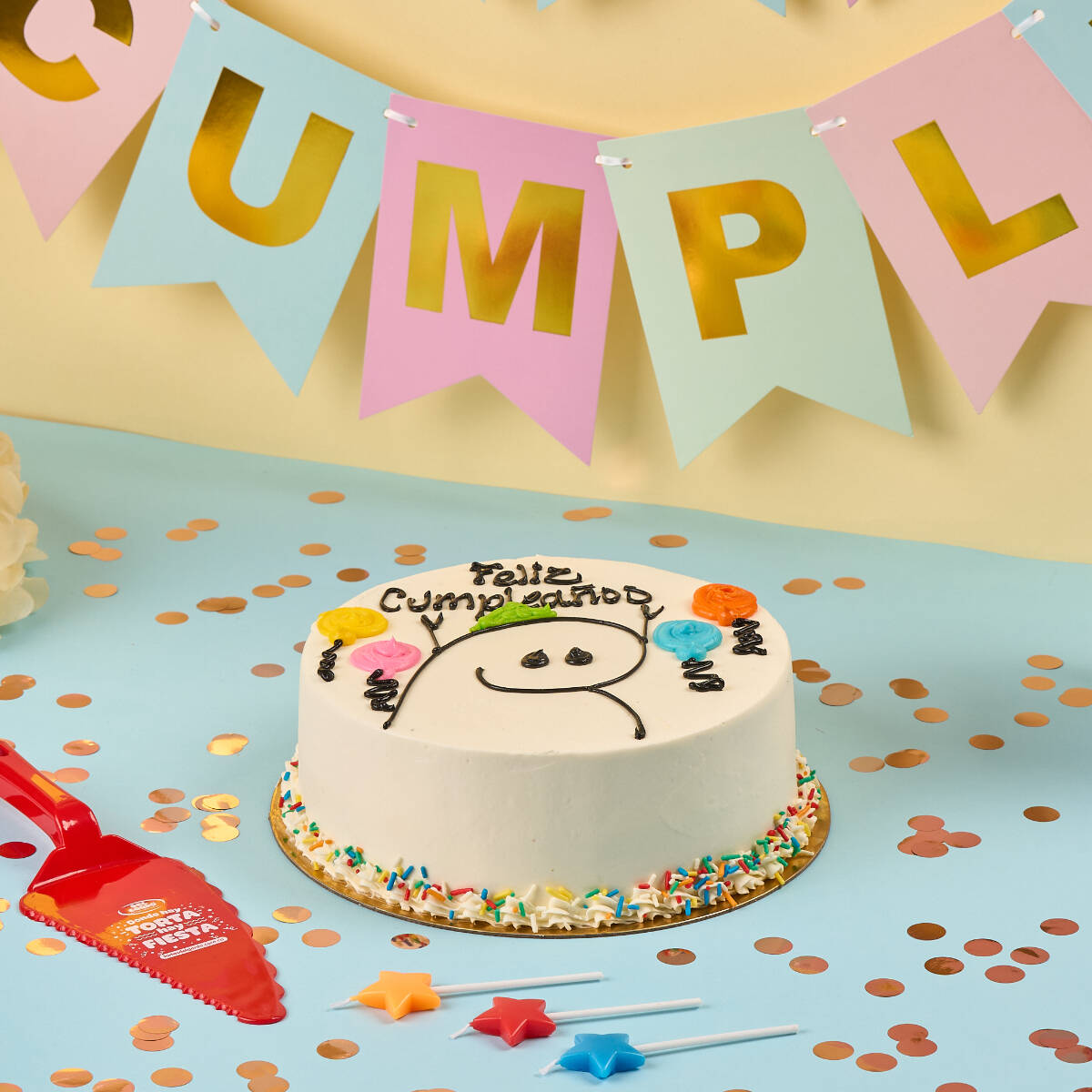10 Porciones, dos capas de torta casera con un característico sabor a leche en polvo, que la hace más suave, en su interior encontrarás un delicioso relleno de arequipe, cubierta con una crema suave sabor a almendras, decorado con un meme con globos y leyenda de feliz cumpleaños.