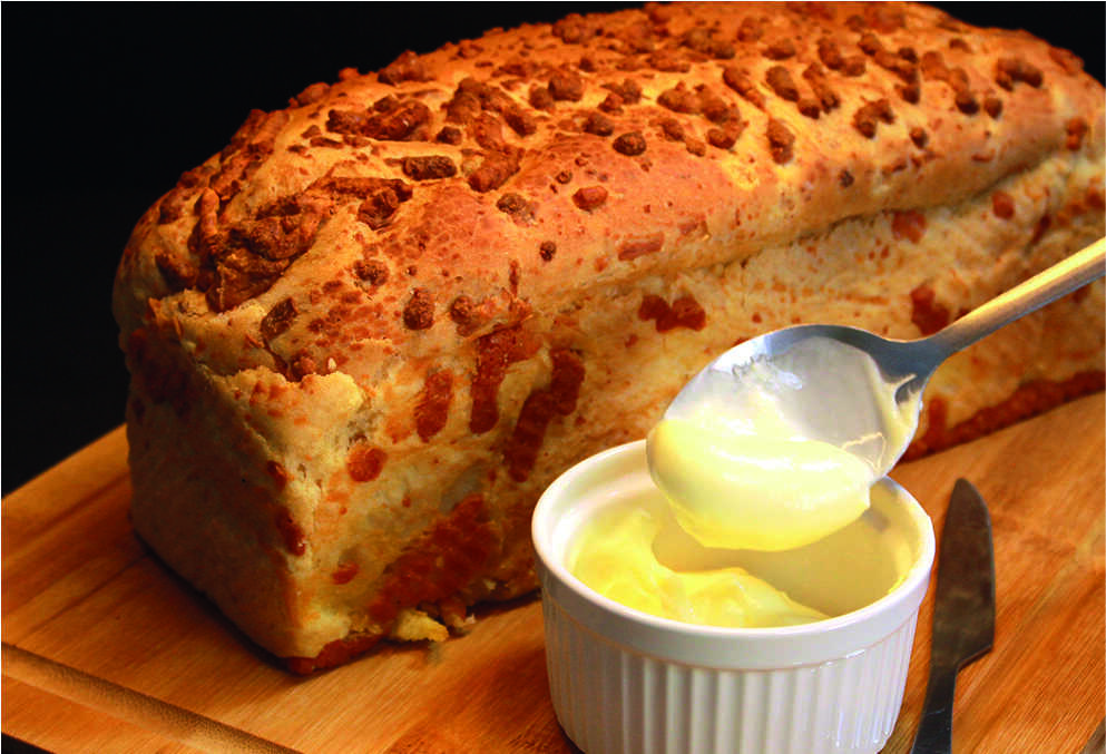 Pan amasado con queso campesino, en su parte superior lleva queso rayado y queso crema, tamaño grande.