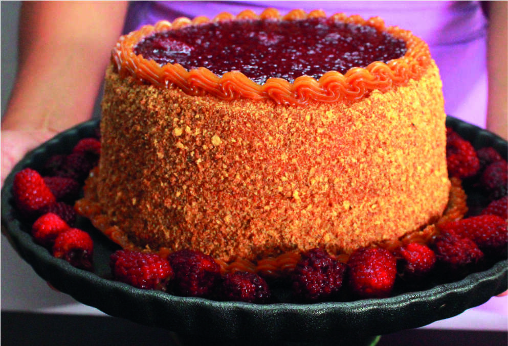 Torta de vainilla con arequipe en el centro, cubierta en arequipe, mora y ripio de galleta, para 30 a 35 porciones.