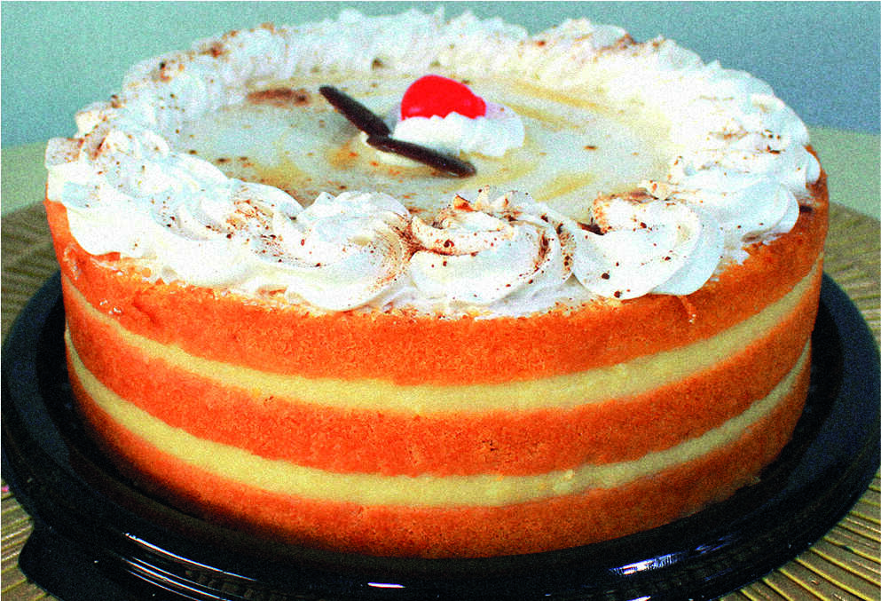 Torta con base de vainilla remojada en jarabe de tres leches: crema de leche, leche condensada, leche entera, 4 a 6 porciones.