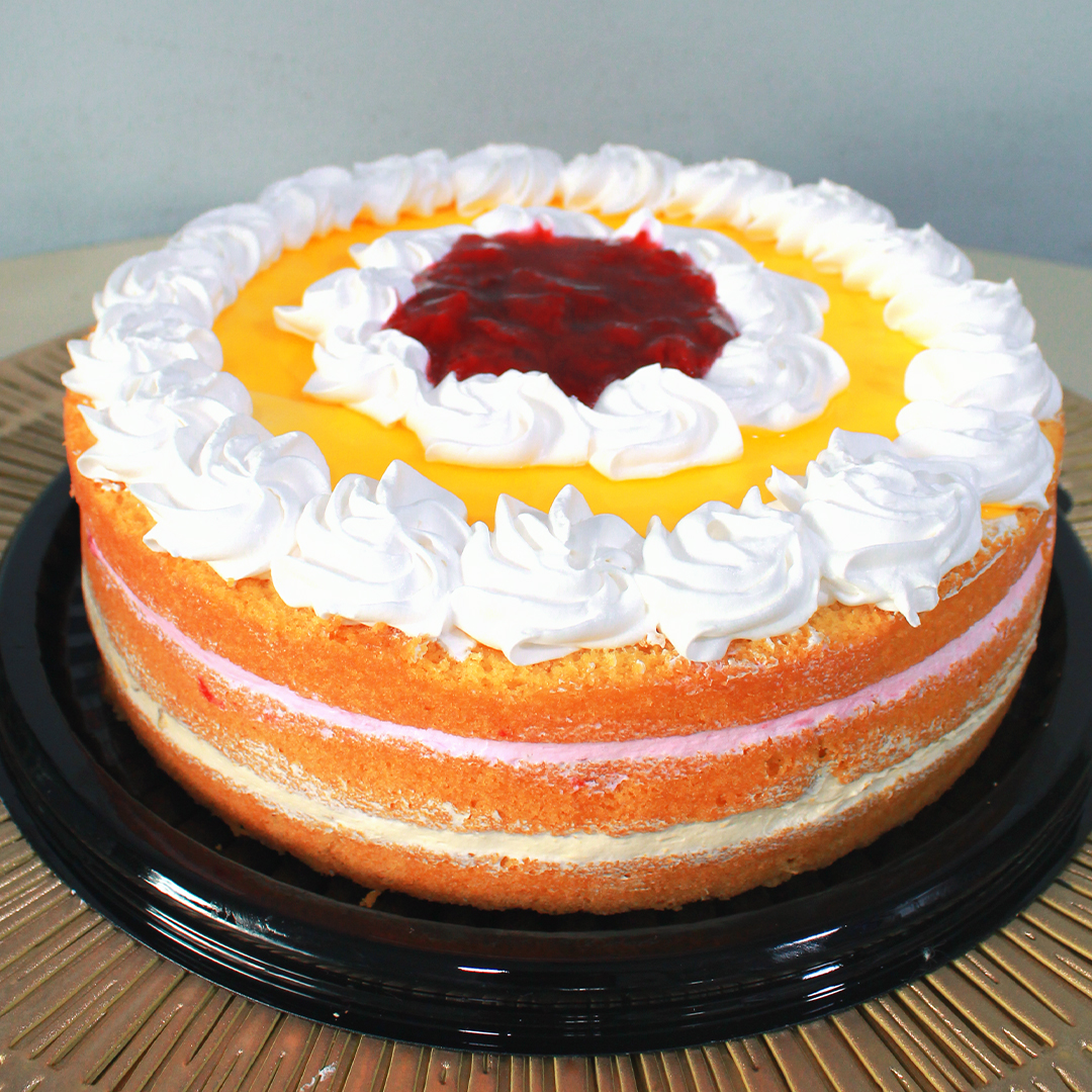 Torta de vainilla rellena con crema de vainilla, dulce de fresa y dulce de melocotón, 15 a 20 porciones.