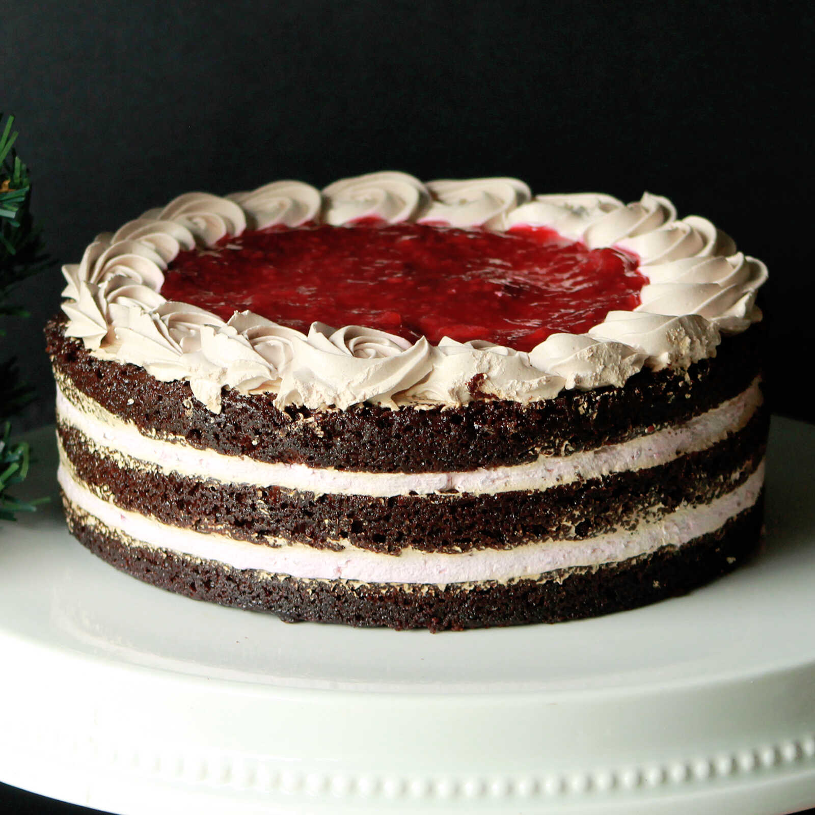 Torta de chocolate rellena con crema de mora y mermelada de mora encima, 15 a 20 porciones.