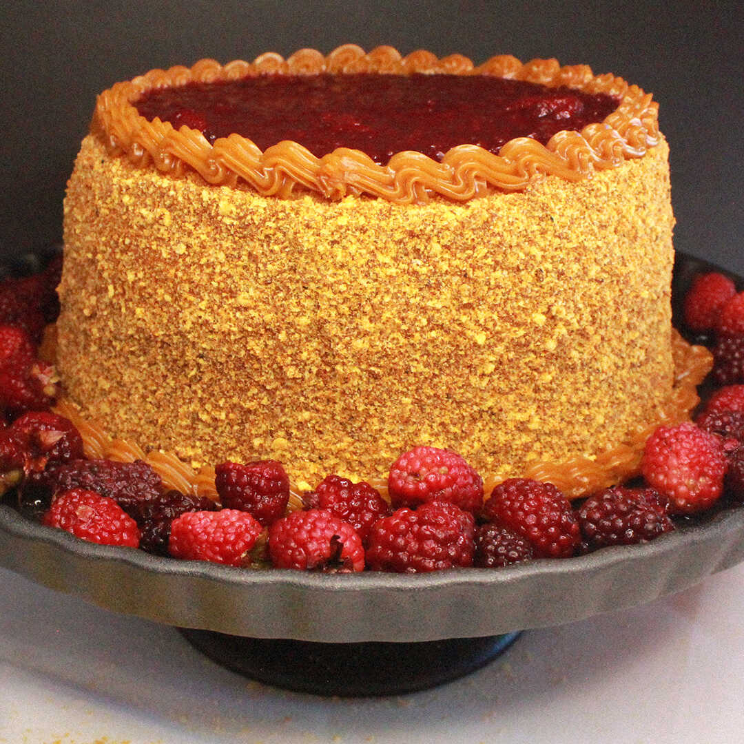 Torta de vainilla con arequipe en el centro, cubierta en arequipe, mora y ripio de galleta, para 10 a 12 porciones.