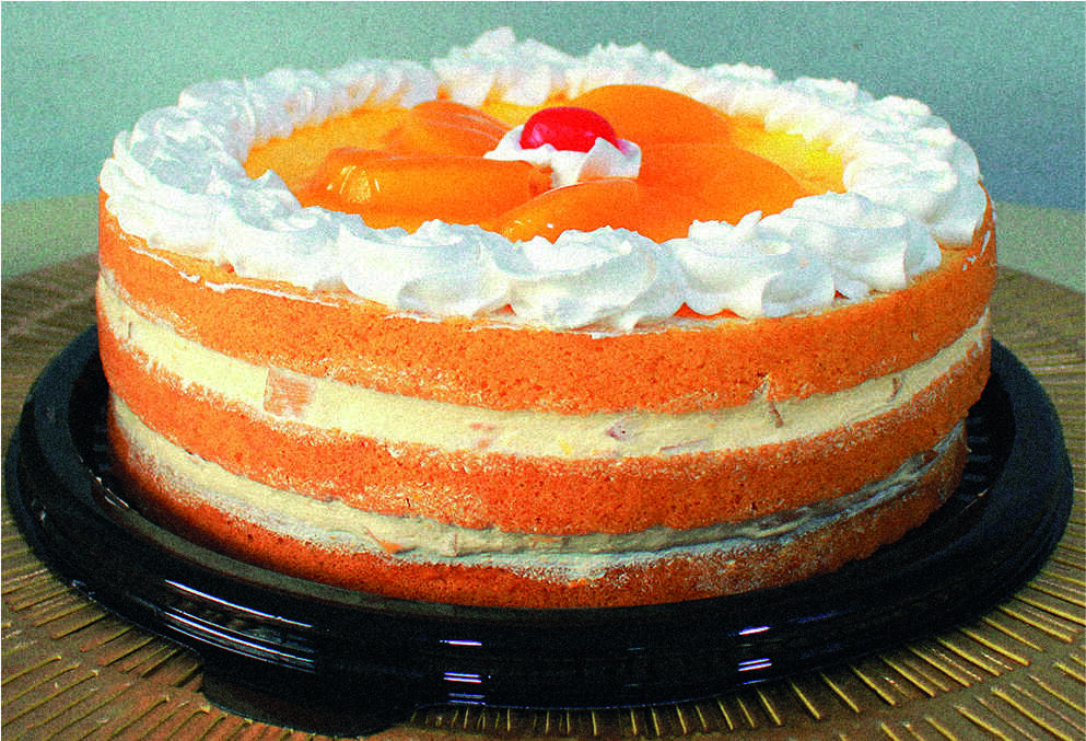 Torta de vainilla rellena con crema de vainilla y dulce de melocotón, 15 a 20 porciones.