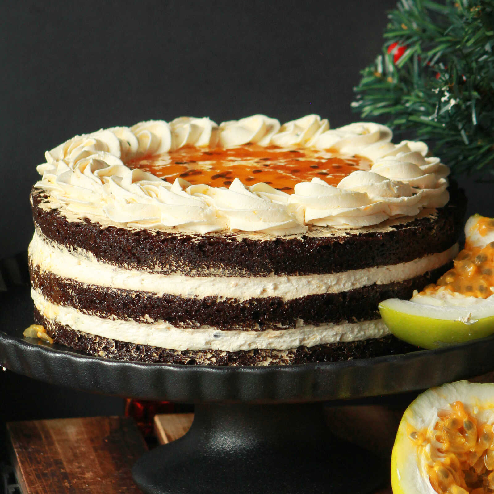 Torta de chocolate rellena con crema de maracuyá y mermelada de maracuyá encima, 15 a 20 porciones.