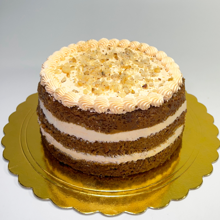 Torta con zanahoria rallada, crema de queso crema, crema de vainilla y toque de limón, de 10 a 12 porciones.