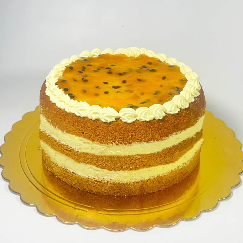 Torta de vainilla rellena con crema de vainilla y dulce de maracuyá, 10 a 12 porciones.
