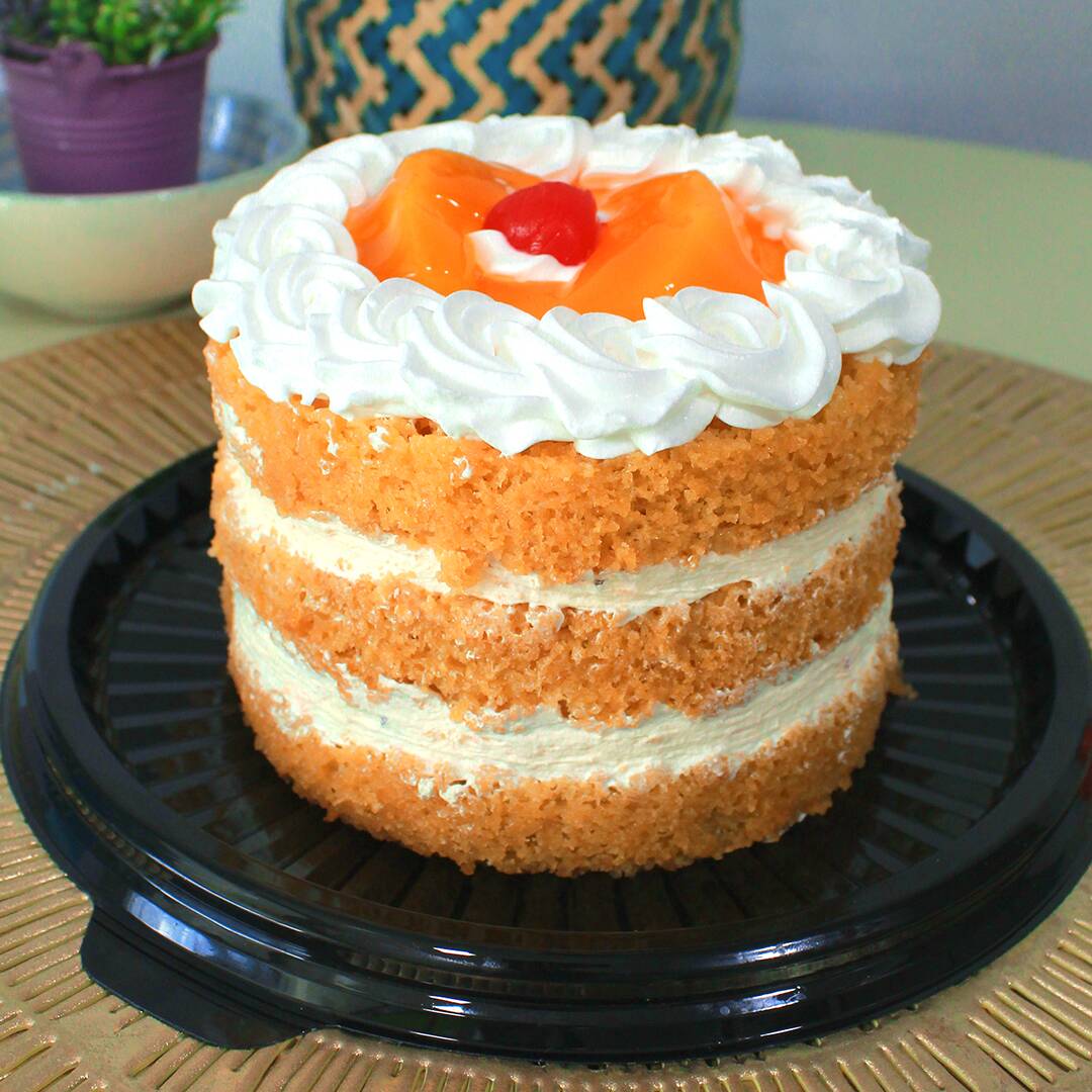 Torta de vainilla rellena con crema de vainilla y dulce de melocotón, 4 a 6 porciones.
