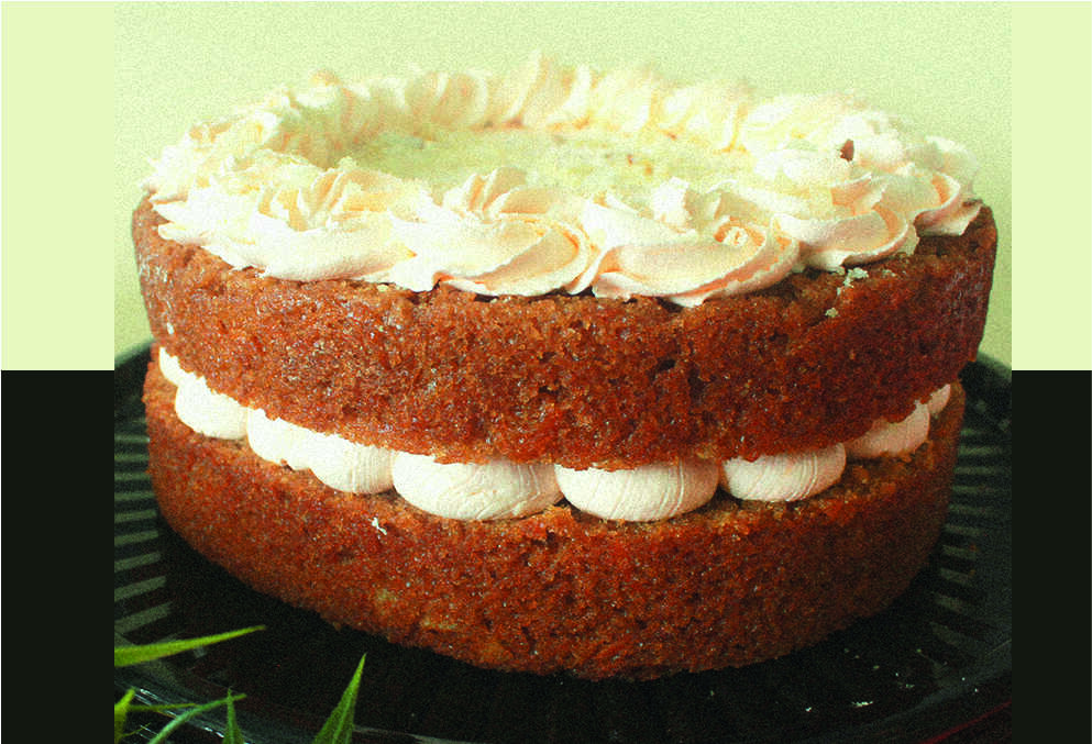 Torta con zanahoria rallada, crema de queso crema, crema de vainilla y toque de limón, 15 a 20 porciones.