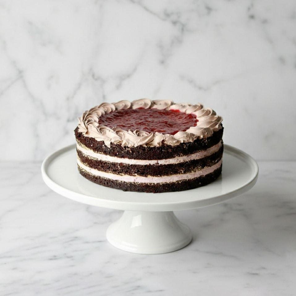 Torta de chocolate rellena con crema de mora y mermelada de mora encima, 15 a 20 porciones.