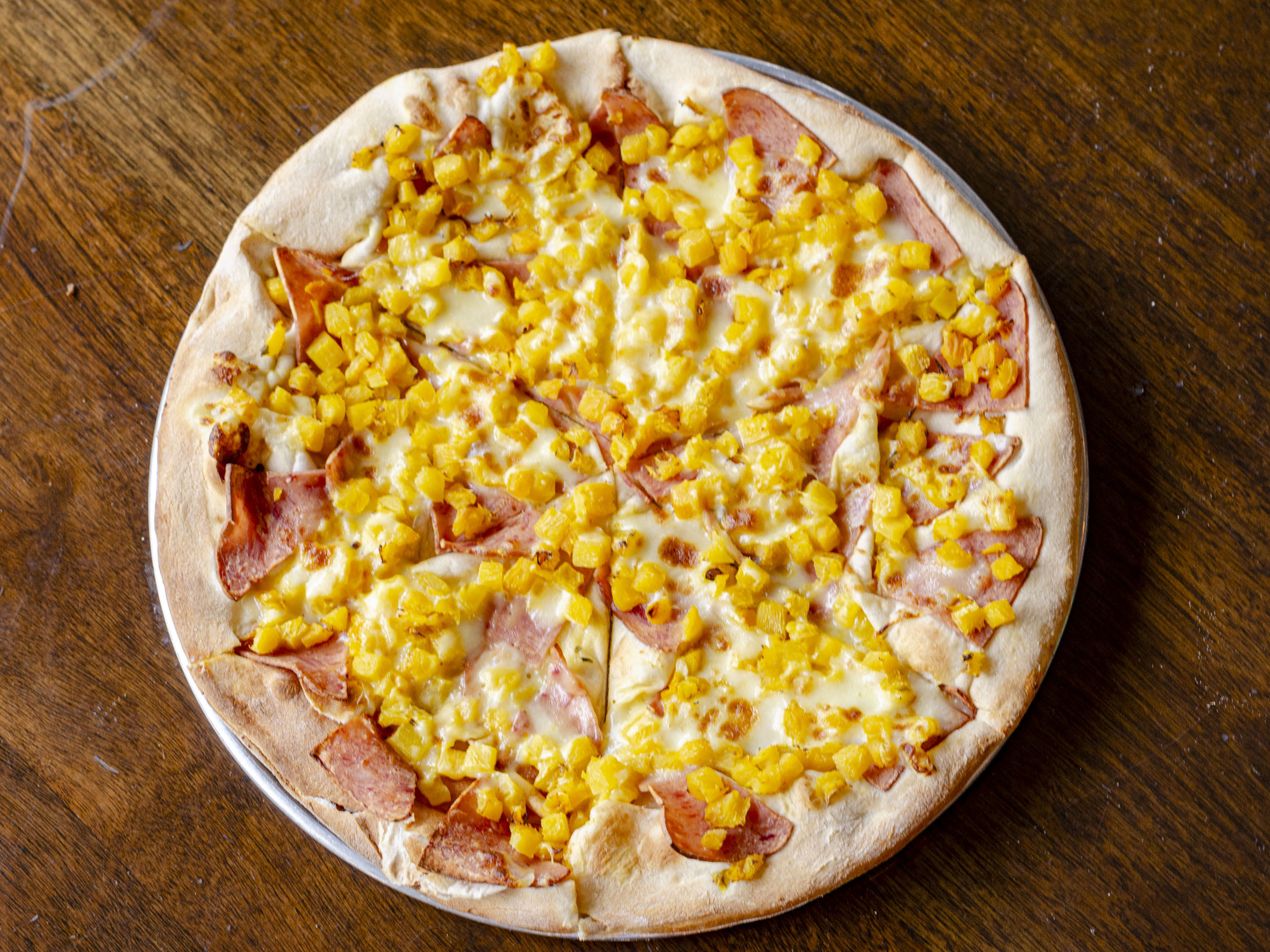 Pizza con masa delgada de 31 cm con 6 porciones de Mozzarella, Piña, Jamón y Base de Salsa Dulce de la Casa.