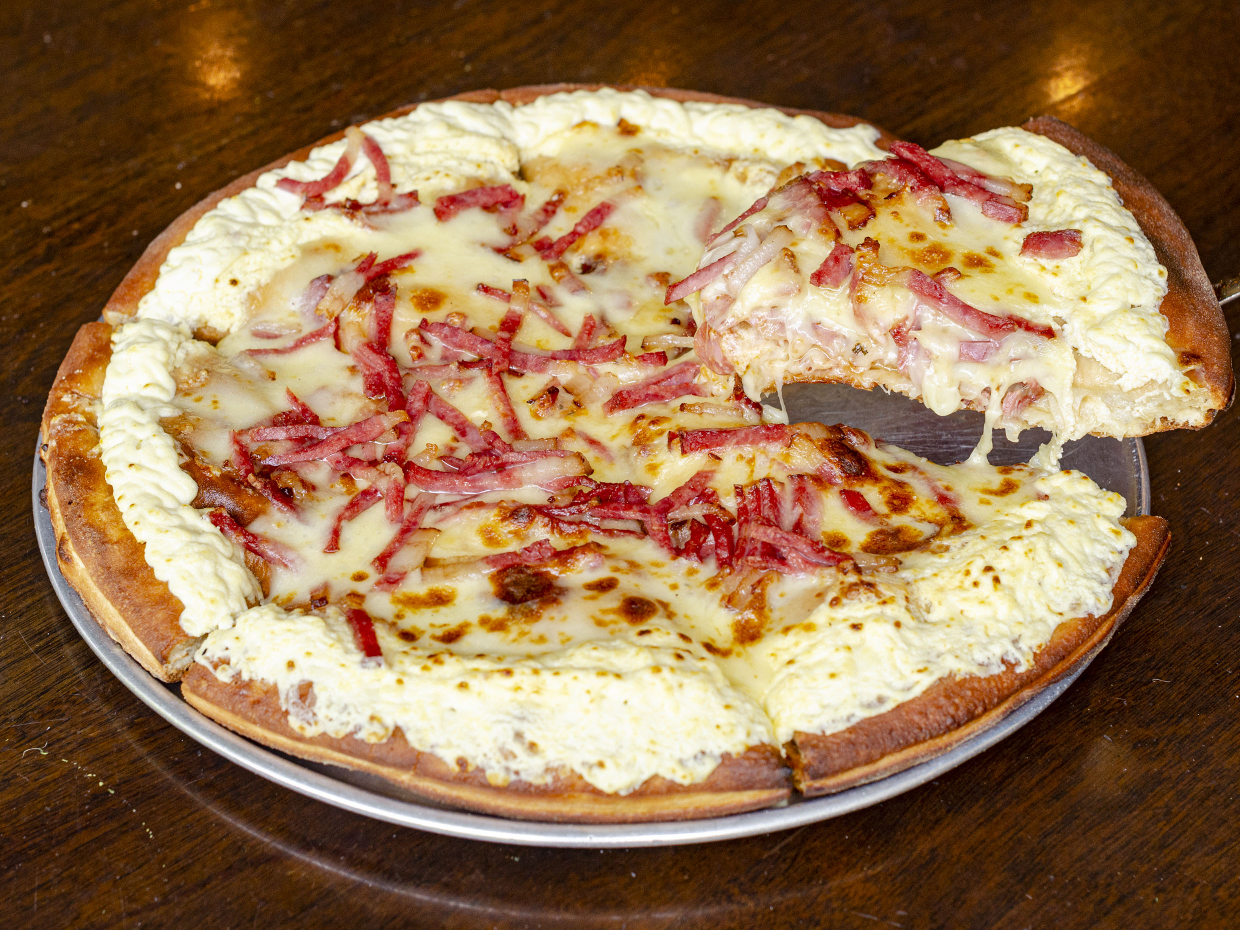 Pizza estofada de 21 cm con 4 porciones de Jamón Cábano, Salami, Queso Mozzarella, Queso Crema, Tocineta Ahumada y base Napolitana de Tomate Orgánico San Marsano.