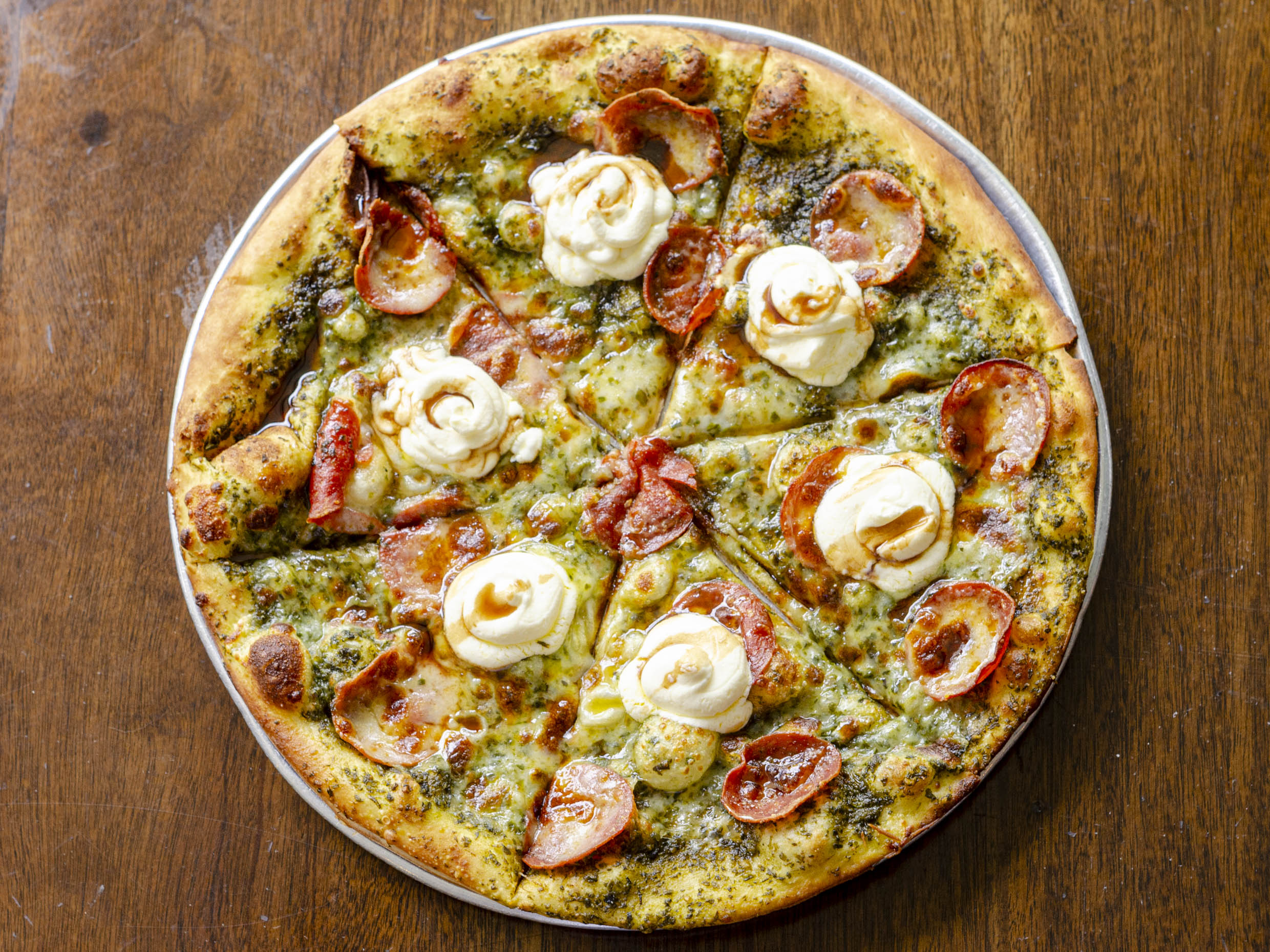 Pizza con masa delgada de 31 cm con 6 porciones de Mozzarella, Pepperoni, Reducción de Balsámico y Toques de Queso Crema y Base de Pesto.