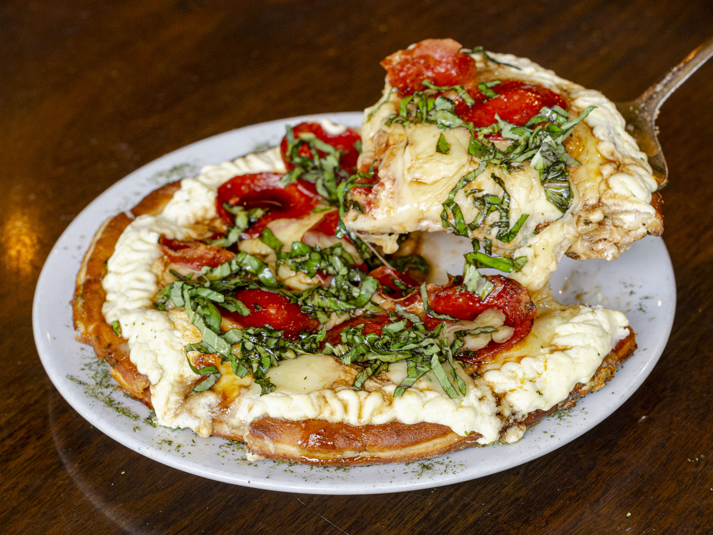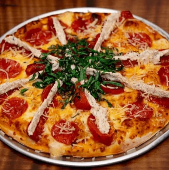 Pizza estofada de 31 cm con 6 porciones de Pepperoni, Tomates Confitado, Queso Mozzarela, Queso Crema, Albahaca, Balsámico y base Napolitana de Tomate Orgánico San Marsano.